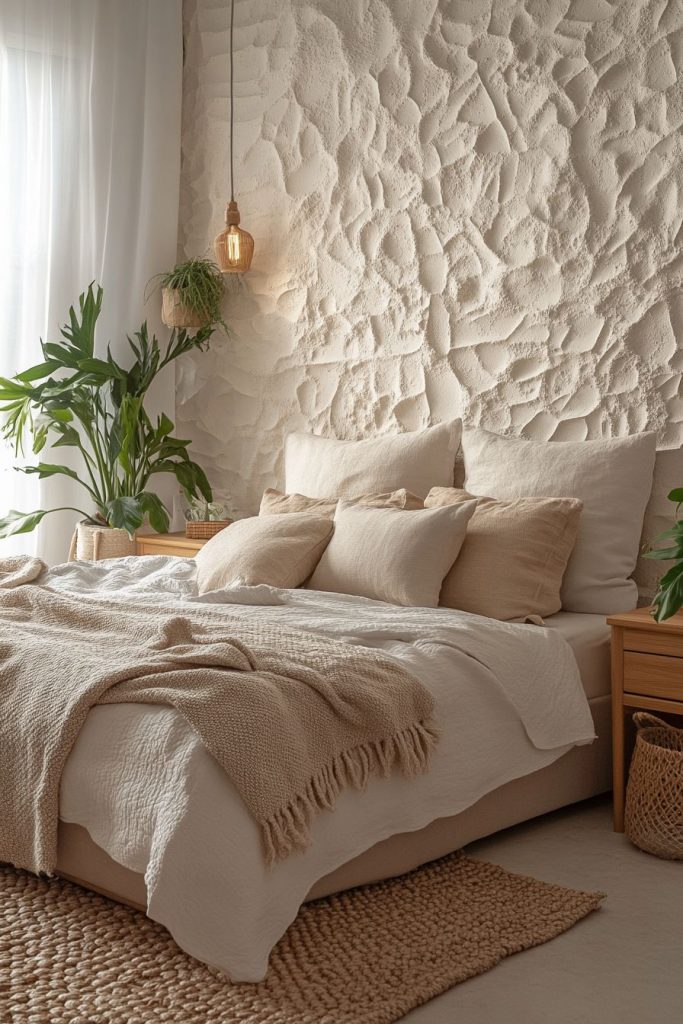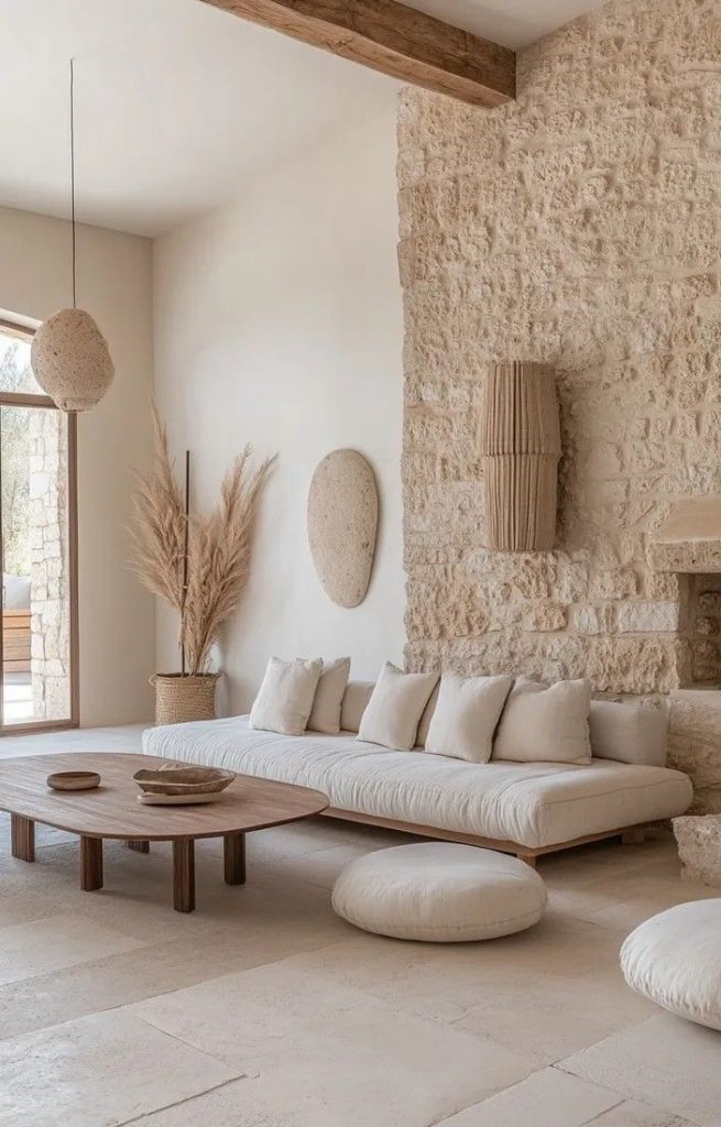 En cambio, si la pared tiene una textura más discreta, puedes jugar con textiles o piezas de diseño que aporten contraste. En los interiores mediterráneos contemporáneos, las mezclas entre cal, piedra y madera logran un equilibrio elegante y atemporal.